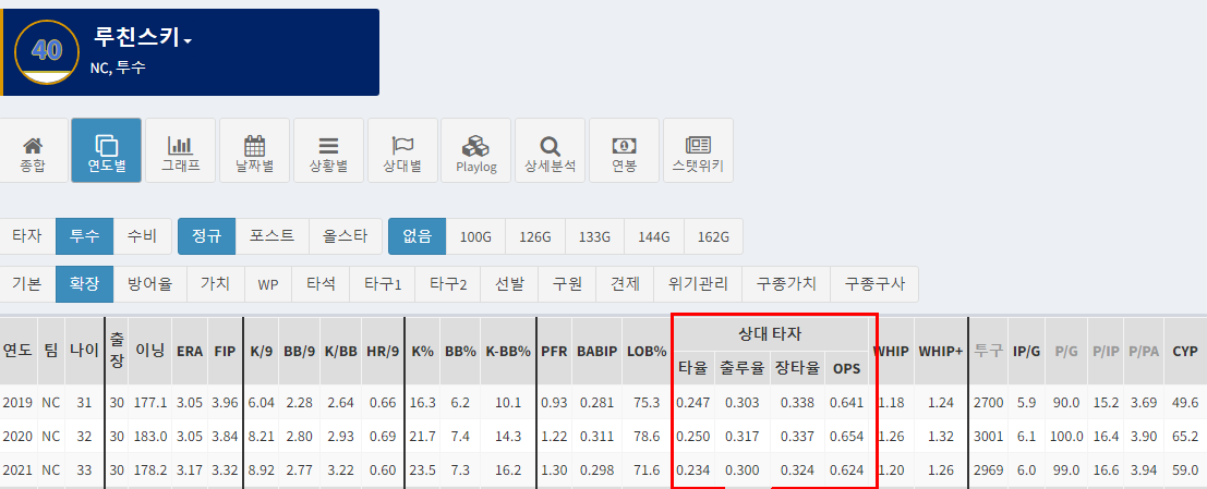 상태 타자로 하여금 출루도 장타도 OPS 역시 적게 낮은 수치를 허용하는 루친스키 선수네요!